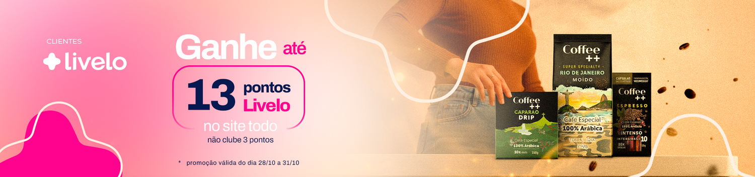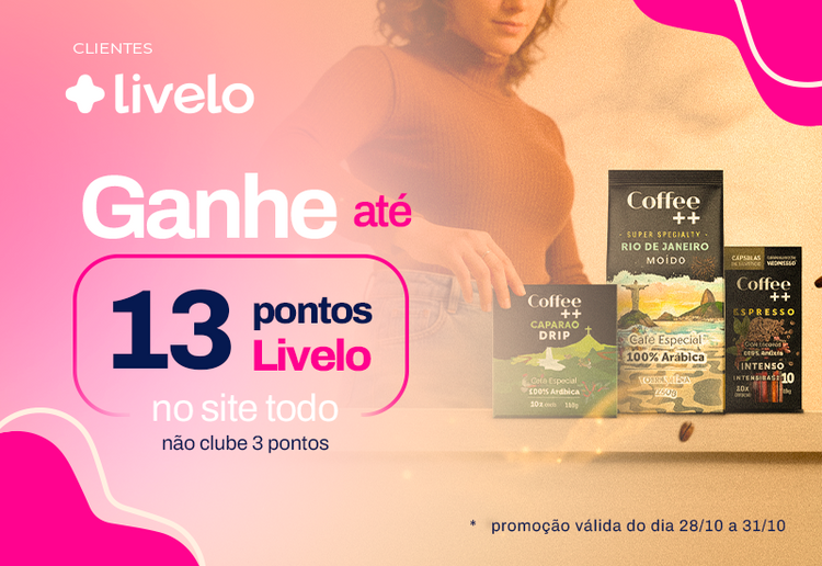 7. ATENÇÃO: O que não acumula Pontos : Não acumulam Pontos Livelo (i) embalagens para presente, (ii) frete, (iii) valores pagos com Cupom de Desconto, gift card e Vale-Compra; (iv) pedidos realizados por pessoa jurídica; e (v) compras realizadas fora do Hotsite. Também não serão creditados Pontos Livelo para (i) pedidos não aprovados ou cancelados; (ii) produtos devolvidos pelo Participante; (iii) caso de suspeita de fraude; (iv) em hipótese de violação deste regulamento ou regulamento do Programa Livelo; e Produtos / serviços que não são vendidos e nem entregues pela Coffee Mais. COMPRAS EFETUADAS EM CANAIS NÃO INFORMADOS NESTE REGULAMETO NÃO SERÃO PASSÍVEIS DE ACÚMULO DE PONTOS LIVELO.